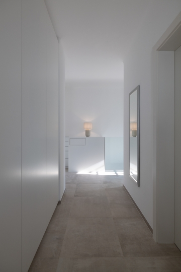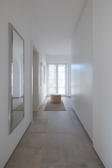 Im Gangbereich wurde ein schlichter und unscheinbarer Schrank-Verbau für die Garderobe eingeplant. Das Gesamtbild wirkt nun freundlich, einheitlich und großzügig.