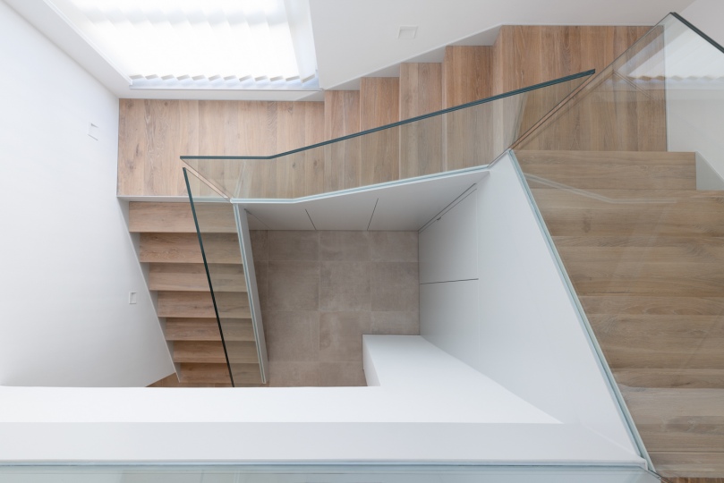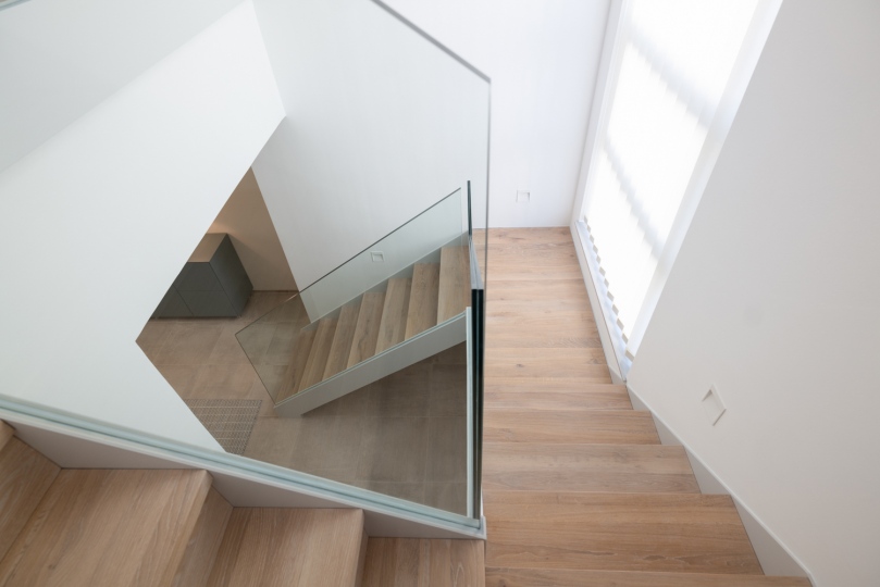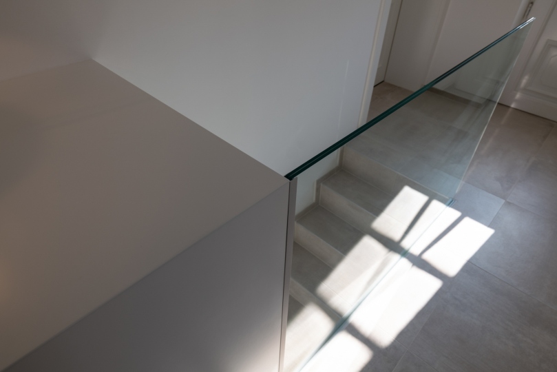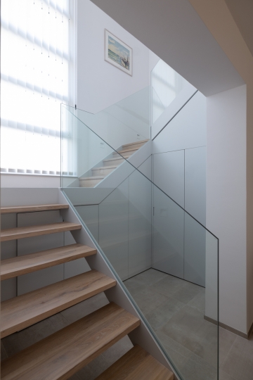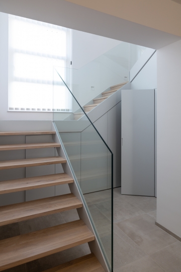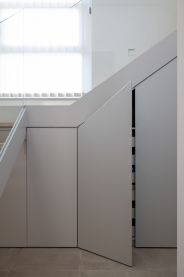 Bei den Materialien haben wir uns für eine lackierte Stahltreppe mit Holzstufen und Glasgeländer entschieden. Der Raum unter der Treppe wurde komplett verbaut und bietet so optimalen Stauraum.