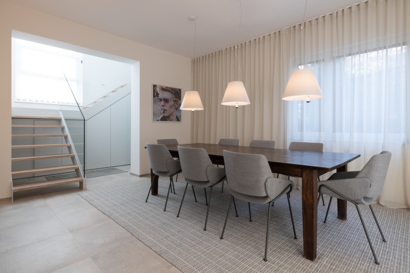 Die offene Garderobe hat Unruhe in den Eingangsbereich gebracht und das Esszimmer wirkte dunkel und wie ein Durchgangszimmer zur Geschosstreppe, welche eine massive, klassische Holztreppe war. Auch an Stauraum fehlte es.