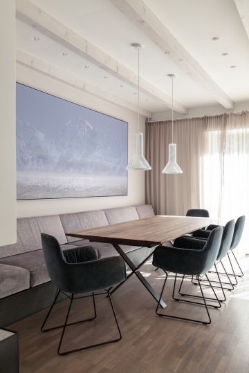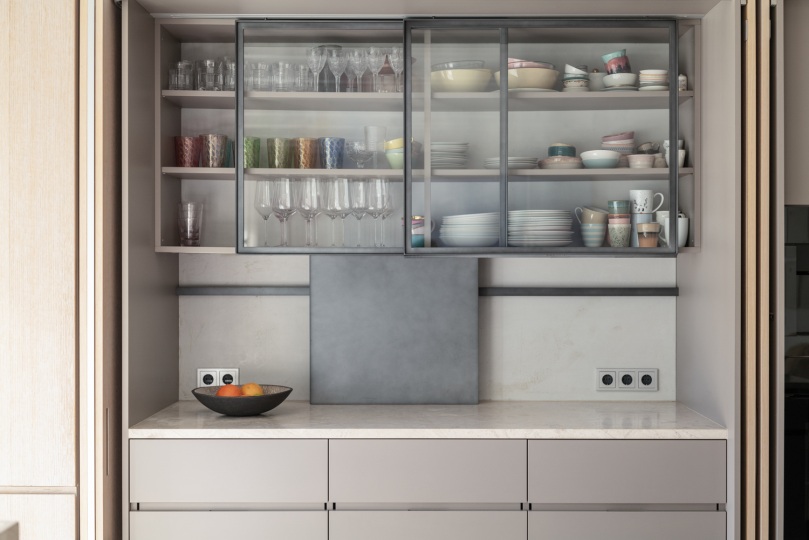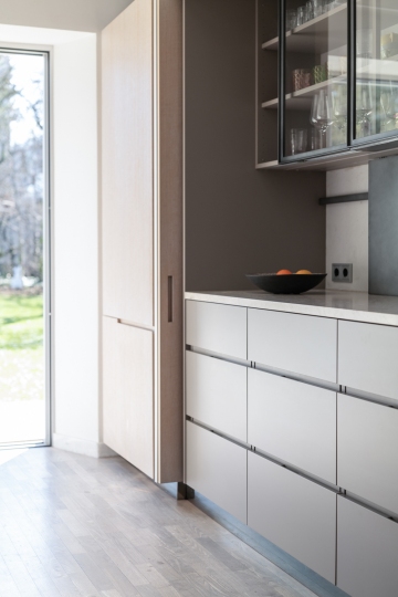 Die Küchenzeile, welche sich entlang der Wand befindet, beinhaltet neben den Geräten zusätzlichen Stauraum. Diese kann je nach Wunsch durch Schiebetüren ganz einfach offen oder versteckt sein. Die Schiebetüren aus hellem Holz wirken wie ein Teil vom Raum und lassen in geschlossenem Zustand kaum erkennen wie viel sich dahinter verbirgt.