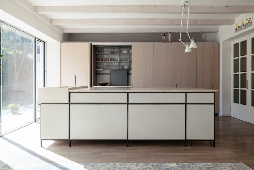 Mittig vom Raum befindet sich die Kochinsel. Die wundervolle Fossil Arbeitsplatte, sandgestrahlt und gebürstet in einem dezentem Beige, geht rücksichtsvoll ins Spülbecken über. Getragen wird sie von einer filigranen Metallkonstruktion in welcher sich Schubladen befinden dessen Fronten lackiert und mit Tadelakt gespachtelt sind. Dadurch, dass die Kochinsel auf feinen Füßen steht, erhält sie eine gewisse Leichtigkeit und passt sich wie ein Möbelstück dem Raum elegant an.