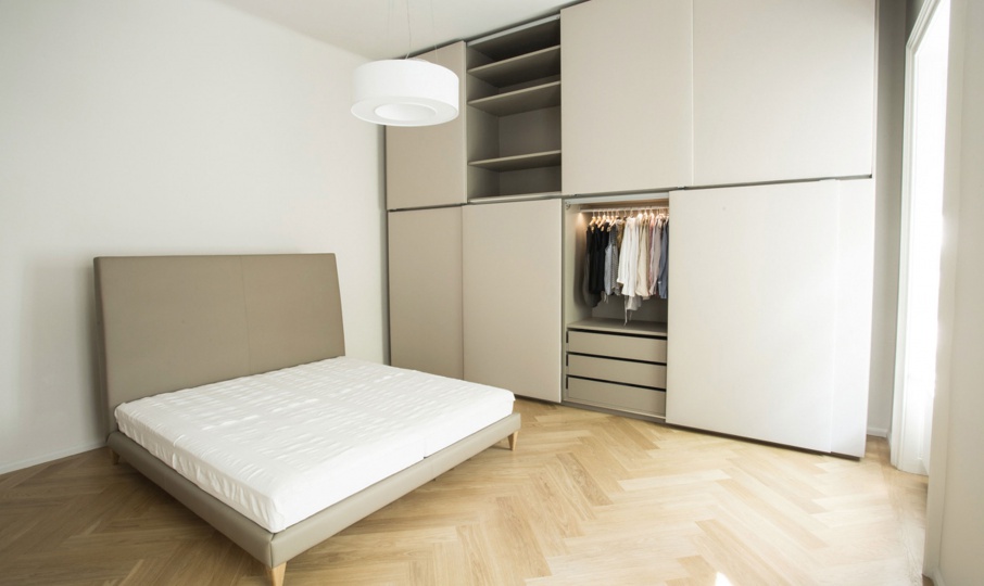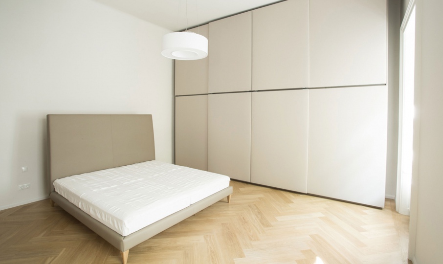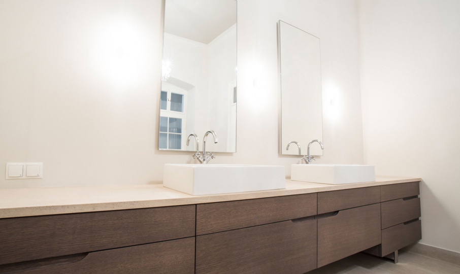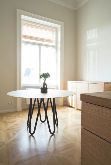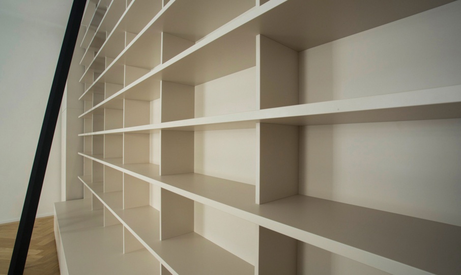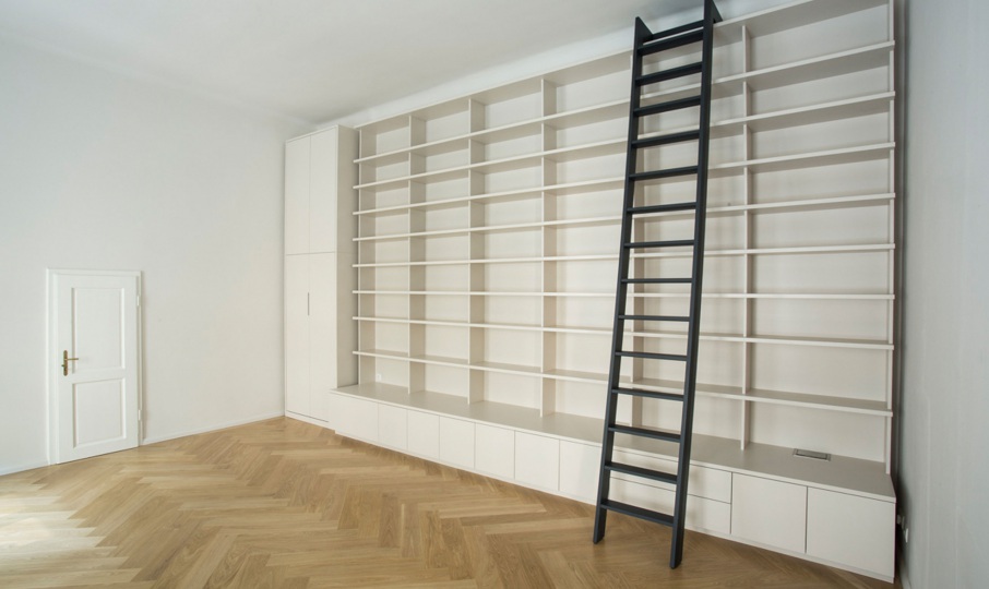 Bei diesem Projekt handelt es sich um die Grundsanierung einer 250 m2 grossen Altbauwohnung mitten im 1. Wiener Gemeindebezirk. Im Zuge der an die Bedürfnisse des Bauherrn angelehnten Grundrissoptimierung, wurde die Küche innerhalb der Räumlichkeiten neu platziert, ein grosszügiges Bad angelegt und zusätzliche Wände für ein Kinderzimmer eingefügt. Das historische Tafelparkett wurde in einer ähnlichen Optik gänzlich neu eingebracht, die Wände überarbeitet und Installationen neu verteilt. Die Wohnungseinrichtung wurde nach individuellen Nutzerwünschen zusammen mit Mobimenti gefertigt, darunter ein Ehe- und ein Hochbett, eine raumhohe Bibliothek, grosszügige Schrankelemente, der freistehende Küchenblock, ein Waschtisch, sowie diverse weitere Einbauten.