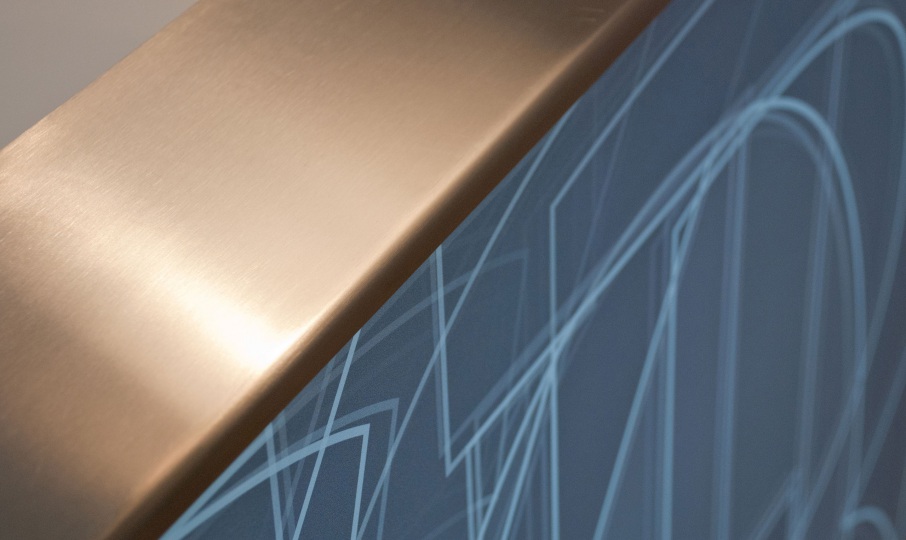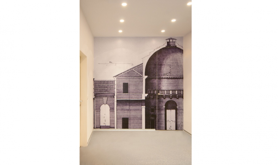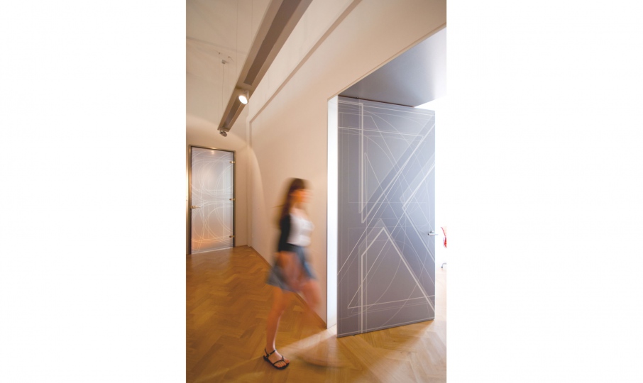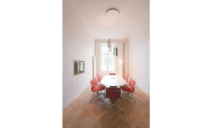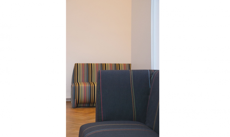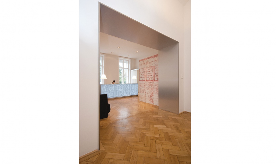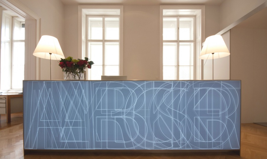 Durch das Zusammenlegen zweier Räume wurde ein großzügiger Empfangsbereich geschaffen. Das Pult ist eine Collage aus den Namen der Anwälte und ergibt ein grafisches Muster. Für die Trennwand wurden unterschiedliche Teile von alten Gesetzsbüchern zu drei raumgroßen Büchern zusammengebaut. Ziel war es, eine Brücke zwischen dem Alten und dem Neuen zu schlagen. Die Polstermöbel wurden, als Anspielung auf die Anzüge der Anwälte, mit einem Stoff mit Nadelstreif Muster bespannt.
