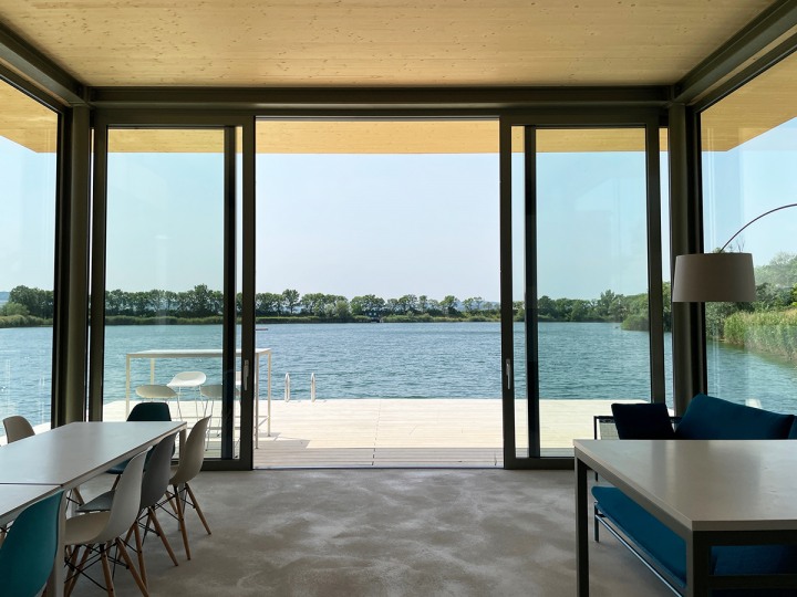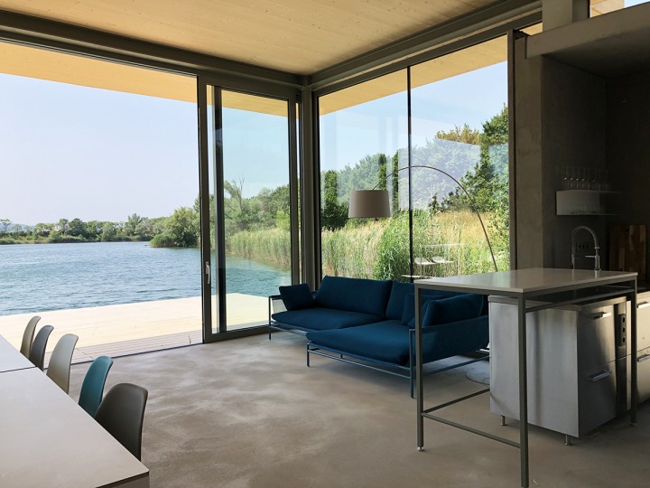 Ein Architekturbüros hat dieses Haus aus Stahlbeton direkt am wunderschönen Steingraben geplant. Anschließend wurde Mobimenti die Aufgabe gestellt, für die gegebenen Räumlichkeiten ein modernes Interieur zu planen. Die klaren, statischen Kanten bilden einen spannenden Kontrast gegenüber dem Wasser welches in ständiger Bewegung ist. Die hohen Fensterfronten lassen den Außen- und Innenraum beinahe verschmelzen, weshalb auch das Sofa so gewählt wurde, dass es flexibel innen oder auf der Terrasse genutzt werden kann.