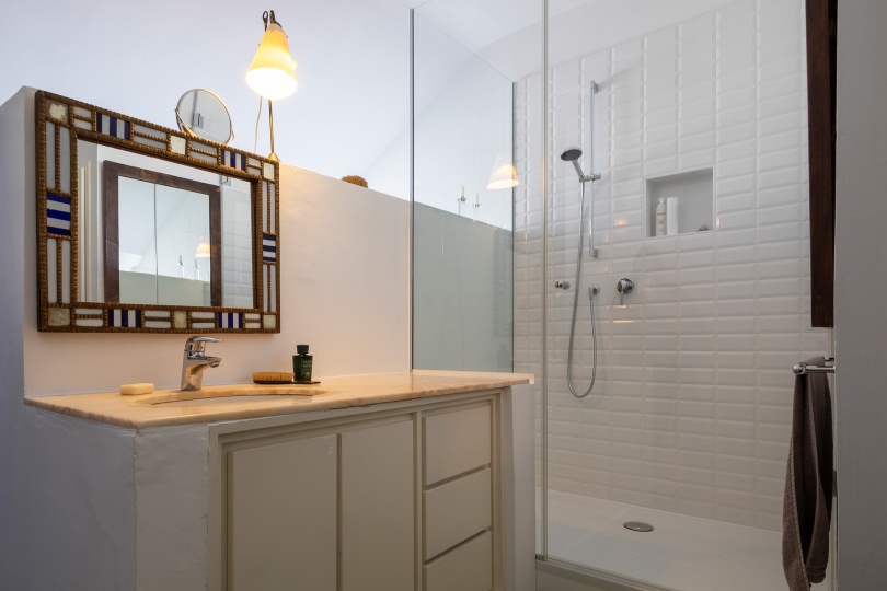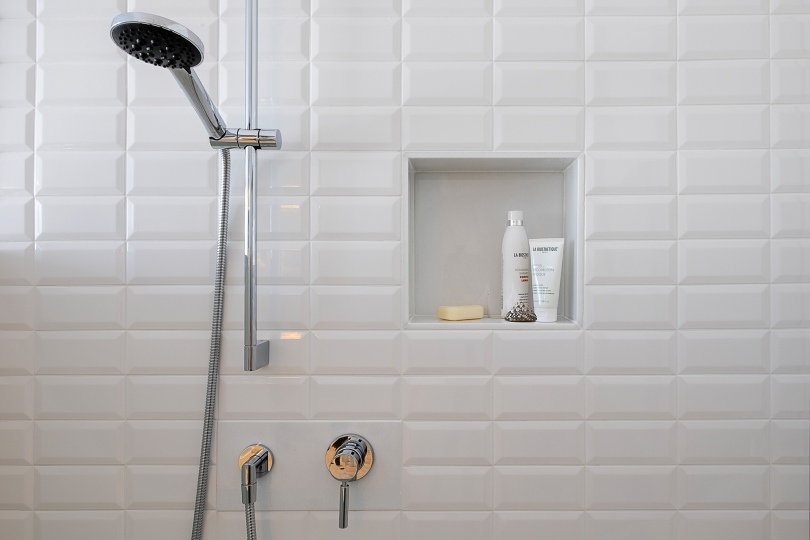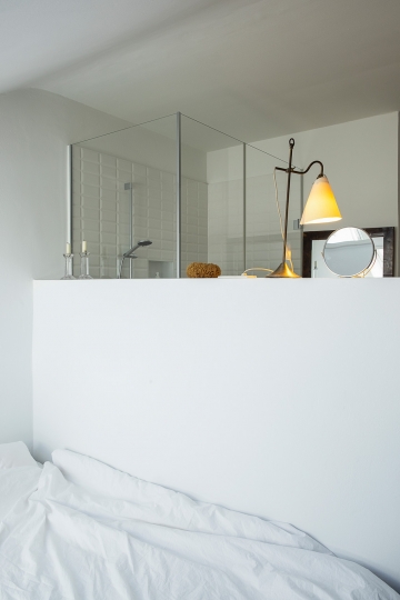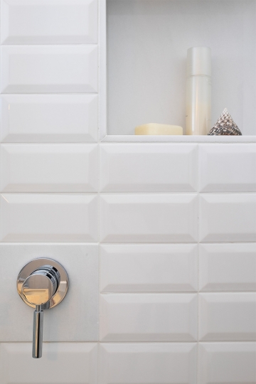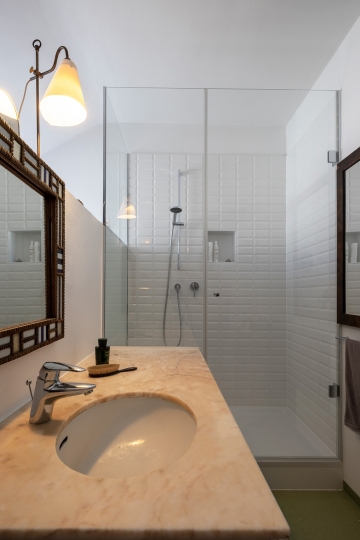 Im Badezimmer entwickelte sich der Wunsch nach einer praktischen Dusche anstelle von der Badewanne. Die weißen Pariser Metro Fliesen passen sich der Ecke dezent an und fallen durch die feinen abgeschliffenen Kanten und die daraus entstehenden leichten Schattierungen ins Auge. Die Duschwände wurden aus Glas geplant um den offenen Grundriss nicht zu stören.