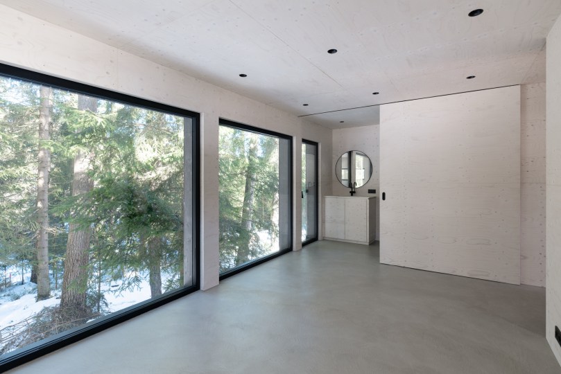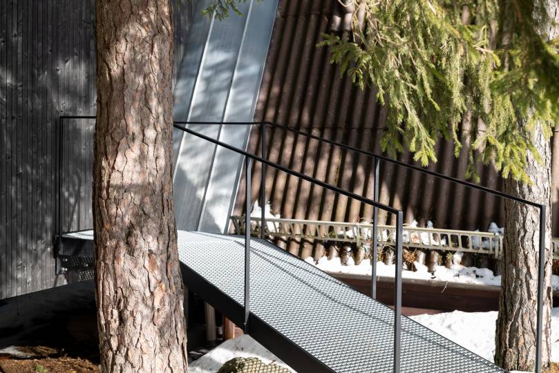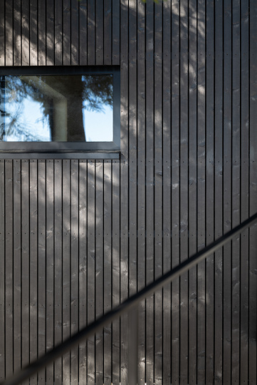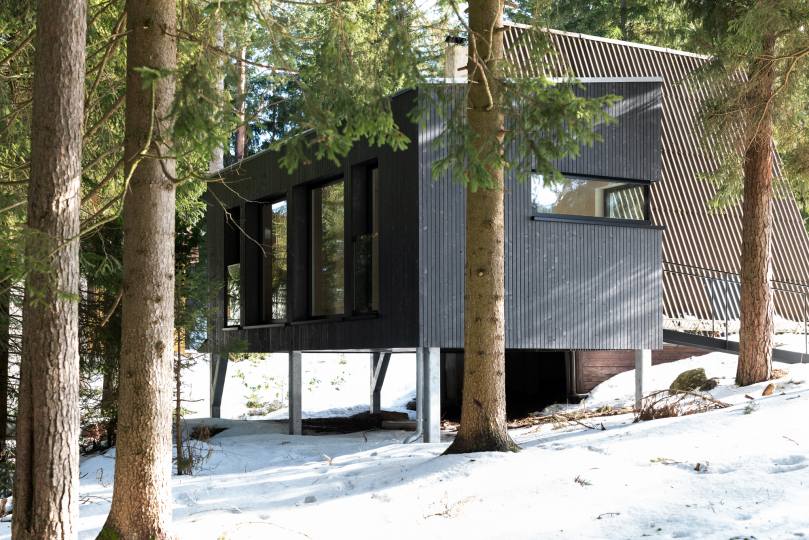 Das Gelände ist in den Wald hinein abfallend. Aus diesem Grund war es wichtig, den Zubau an das Bestands-Niveau anzupassen. Gelöst wurde dies indem wir ihn auf Stelzen gestellt haben. Dies öffnet den Blick in den Wald auf beinahe 2 Meter Höhe. Man befindet sich also mitten in in den Bäumen, beinahe so als würde man sich in einem Baumhaus befinden. Die schwarze, vertikale Holzfassade passt sich der Umgebung an und verschmilzt beinahe mit ihr.
