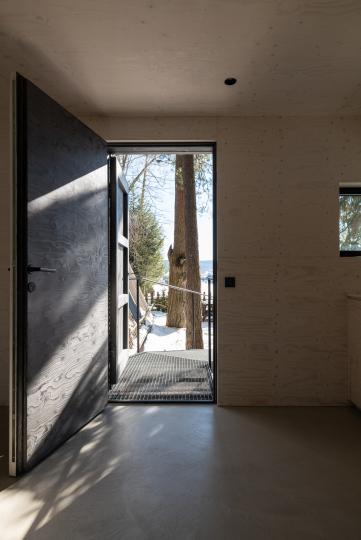 Der Holzriegelbau ist ca 25m2 groß. Die Eingangstür verschwindet durch eine extra angefertigte Doppeltür beinahe unsichtbar in der Fassade. Der filigrane und grafische Steg führt vermeintlich ins Nichts.
