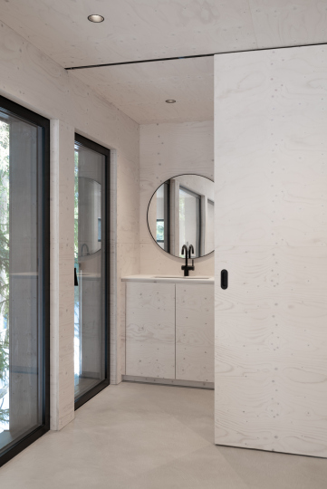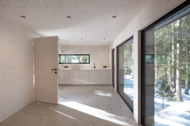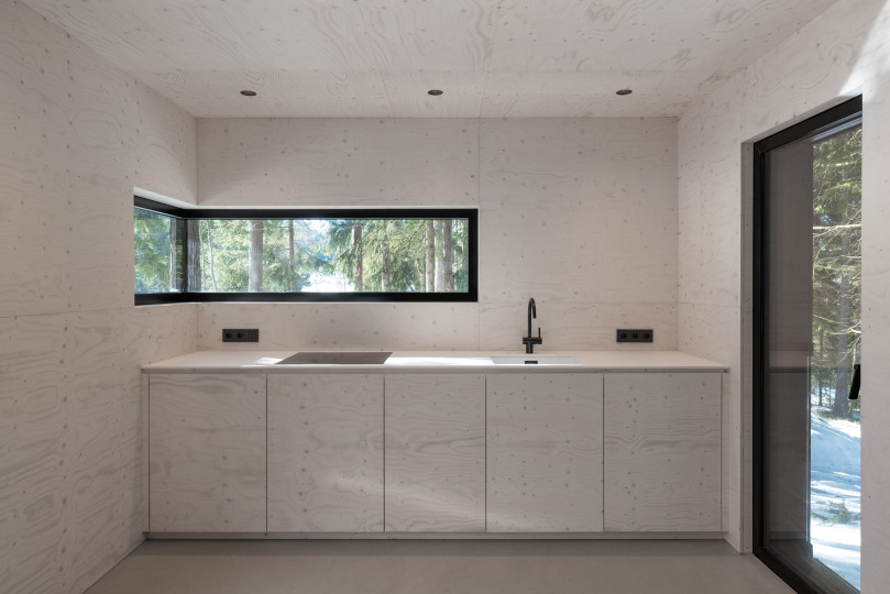 Im Inneren ist alles aus einem Guss - Wand und Decke, Küchenmöbel und Badmöbel wurden in weiß lasierten Sperrholzplatten ausgeführt. Der Zubau öffnet sich komplett nach hinten raus, was durch die riesige Fixverglasung ermöglicht wurde. Das einstrahlende Sonnenlicht durchströmt die Räumlichkeiten und lässt sie so hell und einladend wirken.