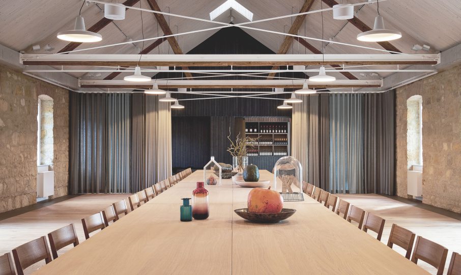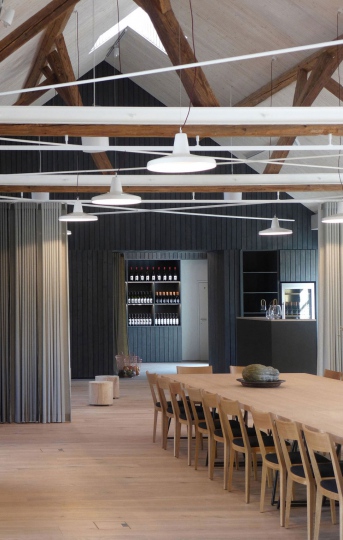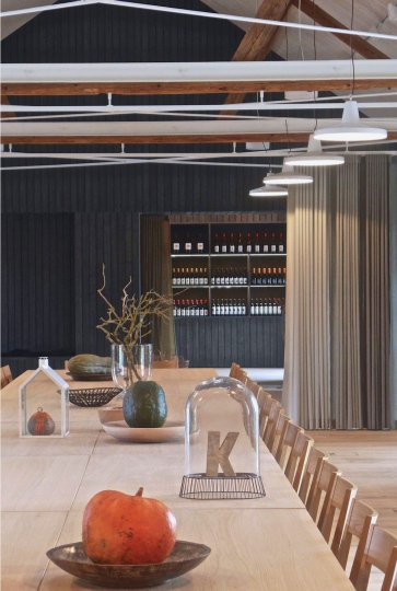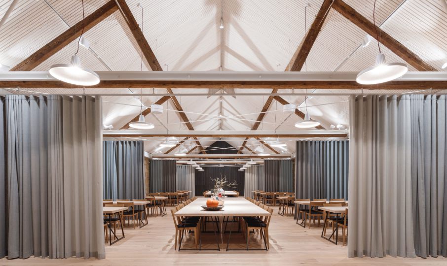 Für den Hauptraum wurde ein die Atmosphäre stärkendes Beleuchtungskonzept entwickelt, das nicht nur auf die technischen Belange der Nutzung hinzielt, sondern darüber hinaus eine wohnlich gastronomische Atmosphäre abbildet. Abgehängte Porzellan- Pendelleuchten, die zwischen Raumhöhe und menschlicher Proportion vermitteln, nehmen die einfache industrielle Gestalt von Gegenständen aus dem Bereich Landwirtschaft auf.