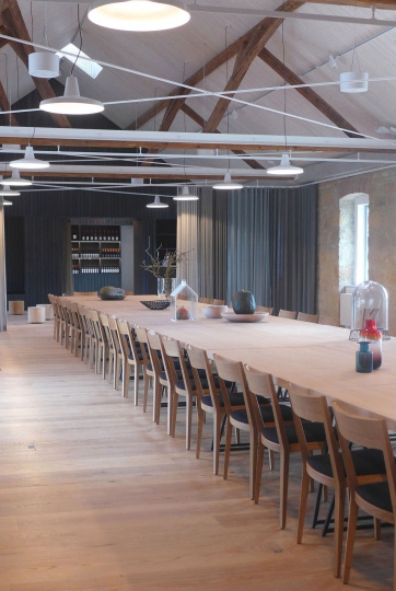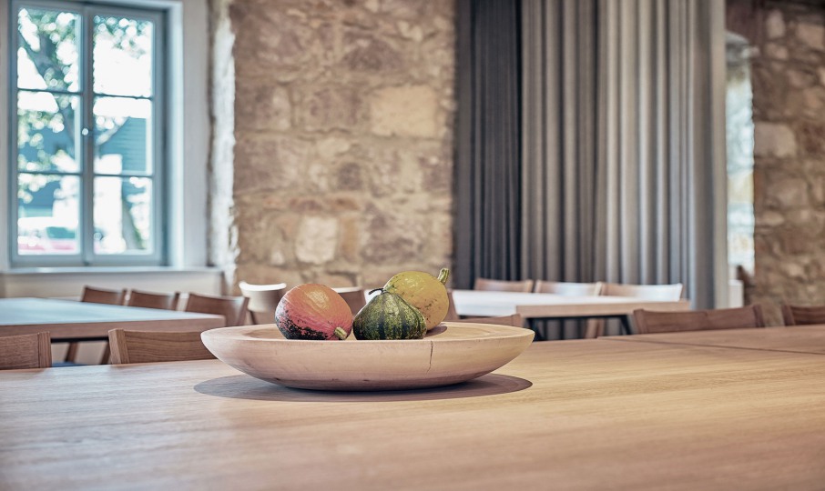 Die Möblierung wird den Ansprüchen einer vielseitigen Nutzung gerecht. Das Konzept sieht eine Grundmöblierung gut verarbeiteter, rechteckiger Holztische mit Vollholzplatte und Stahlgestell vor. Die Gestelle werden eigens zusammen mit einem Schlosser als feine Klappgestelle entwickelt. Die Tische können zu einer Großtafel zusammengestellt werden, sodass Veranstaltungen von bis zu 200 Personen möglich werden.
