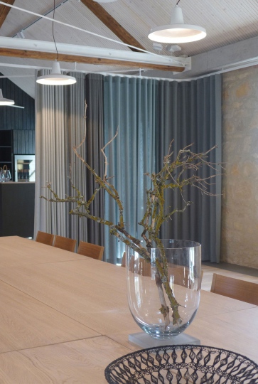 Herausforderung war es, dem unproportionalen Lang- und Einraum eine angenehme sowie funktionale Raumstruktur und Gestaltung zugrunde zu legen. Hierzu sind Raumabschnitte wichtiger Konzeptbestandteil, die durch flexible Trennvorhänge aus Leinen in feinen Farbabstufungen erzeugt werden. Große geschlossene Kreisläufe gezielt gesetzter Vorhangschienen machen Raumteile und Zonen, sowie Kabinette möglich. Der Großraum lässt sich so in 5 Zonen unterteilen.
