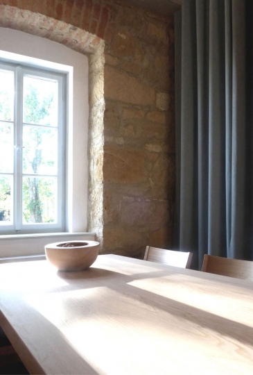 Ziel vom Entwurf war es, den Charakter der Gebäudehistorie und des Standortes im ländlich schönen Burgendland, zeitlos interpretiert herauszuarbeiten. Ein wesentliches Anliegen war es, das freigelegte Sandsteinmauerwerk mit einzubeziehen, sowie die bestehende Dachstuhlkonstruktion zu erhalten. Die Materialwahl von Boden, Wand, Möblierung und Raumtrennung, sowie die Lichtatmosphäre, beziehen sich auf das Bild eines modern interpretierten Landhauses.
