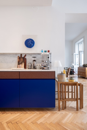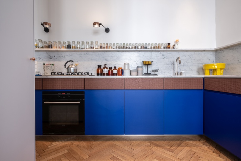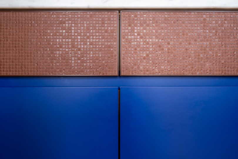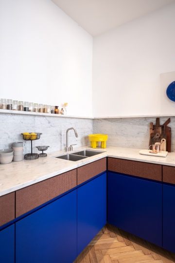 Die Arbeitsplatte und die Rückwand wurden mit einem schönen Carrara Marmor ausgeführt, während die Schrank- und Schubladenfronten entweder in Yves Klein Blau lackiert oder mit mini Fliesen in rotbraun ausgeführt wurden. Die Farb- und Materialvielfalt war ein großes Anliegen.