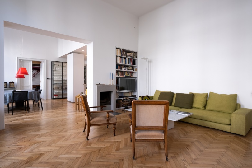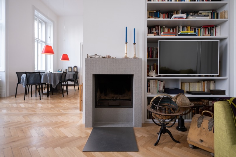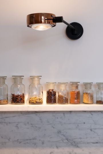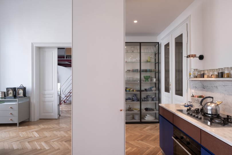 Die Küche wurde zusätzlich mit einem Glasschrank von Porro ergänzt welcher der Geschirraufbewahrung dient.