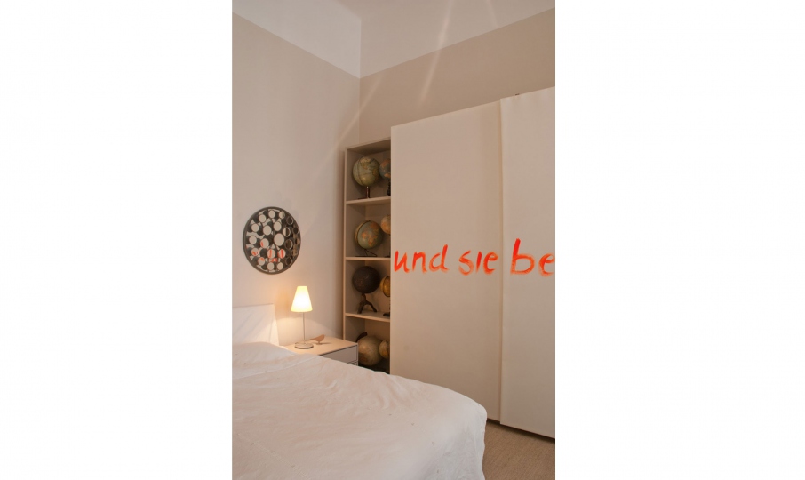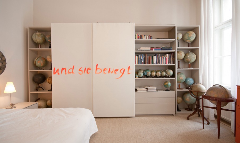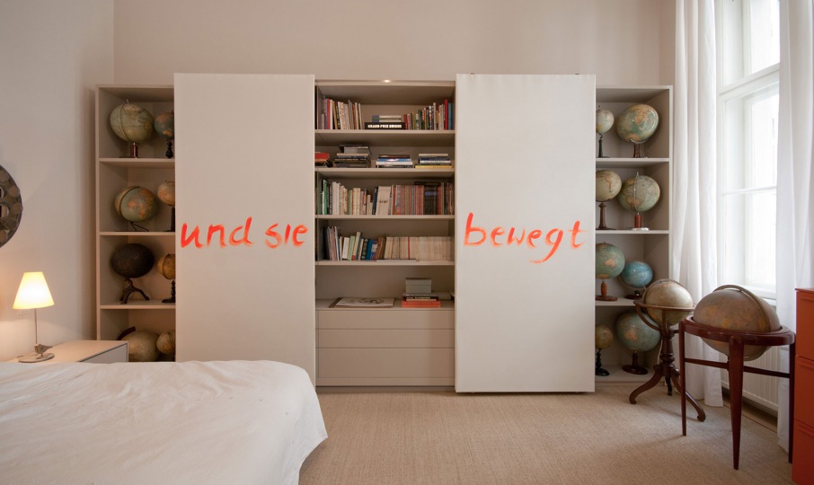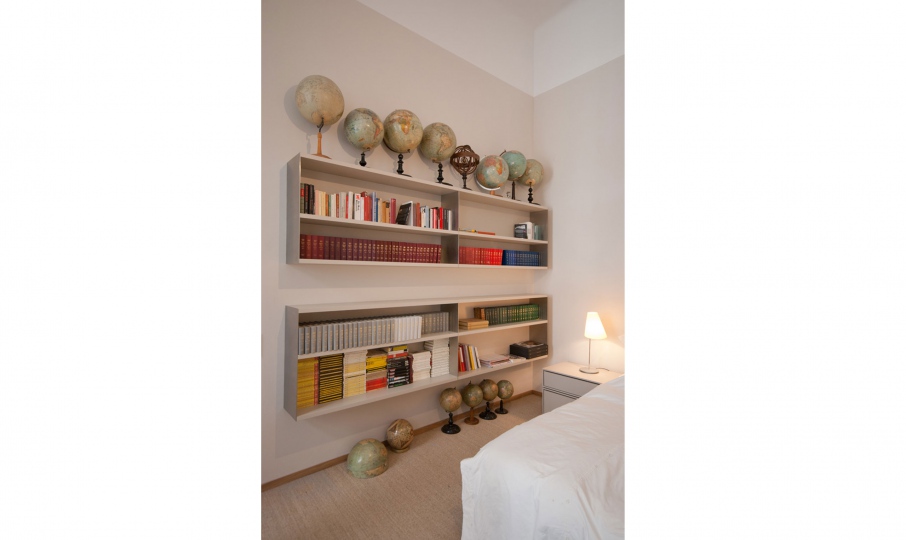 Sammlerregal mit Bibliothek, in Wandfarbe schwebend und leicht anmutend, die Gegenstände selbstverständlich fassend. Auf der gegenüberliegenden Seite wird das nahezu gespiegelte Regal durch textil bespannte Schiebeelemente beruhigt.