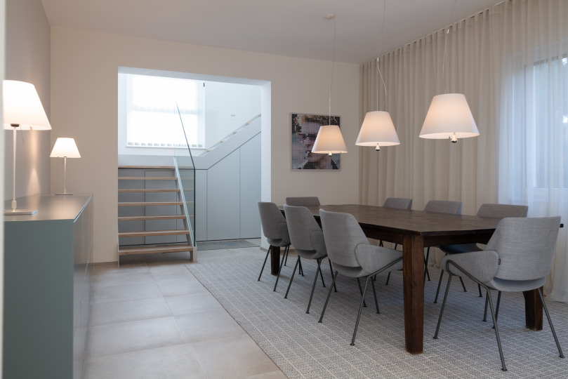 Die offene Garderobe hat Unruhe in den Eingangsbereich gebracht und das Esszimmer wirkte dunkel und wie ein Durchgangszimmer zur Geschosstreppe, welche eine massive, klassische Holztreppe war. Auch an Stauraum fehlte es.