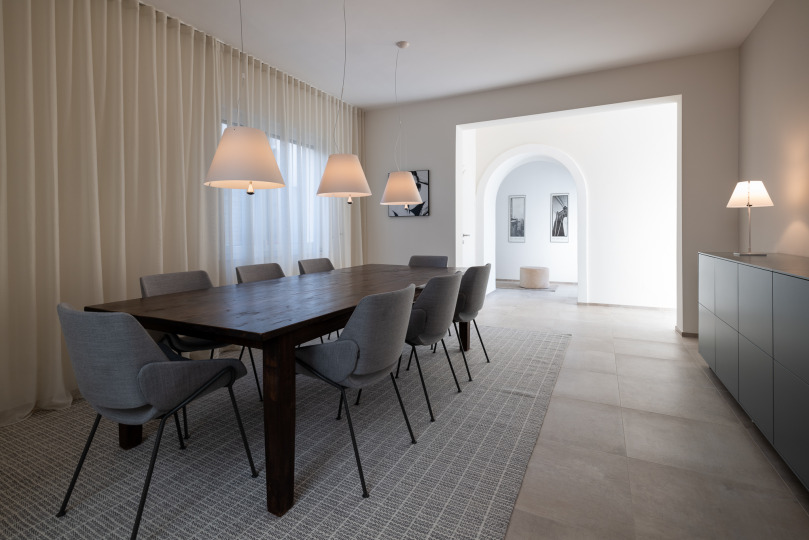 Der alte große Tisch im Esszimmer ist Bestand zu welchem neue Stühle und Vorhänge kombiniert wurden.