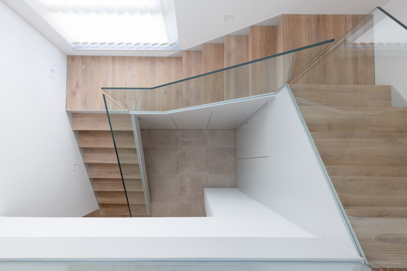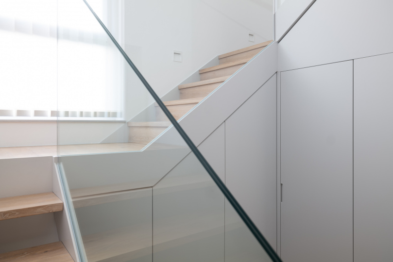 Bei den Materialien haben wir uns für eine lackierte Stahltreppe mit Holzstufen und Glasgeländer entschieden. Der Raum unter der Treppe wurde komplett verbaut und bietet so optimalen Stauraum.