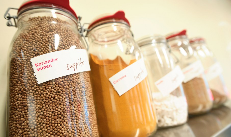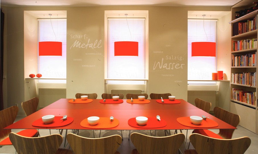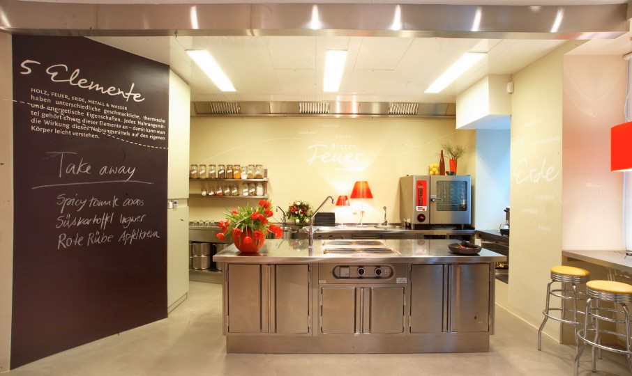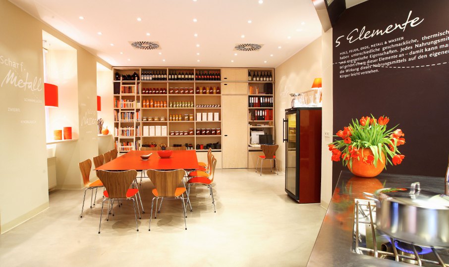 Im chinesischen Sinne wird nach den 5 Elementen gekocht. Gewürze sind hierzu wichtige Ingredienzien, deren verschiedene Tonstufen zum Leitkonzept der Farbgebung von diesem Projekt herangezogen wurden. Dem Auftraggeber war es ein Anliegen, mit den Räumlichkeiten auch das Zelebrieren von gesundem Kochen zu vermitteln.