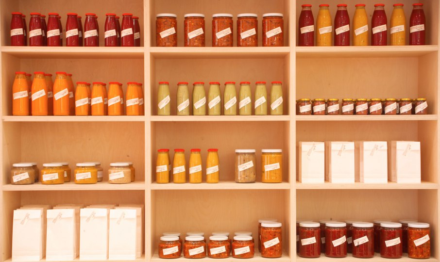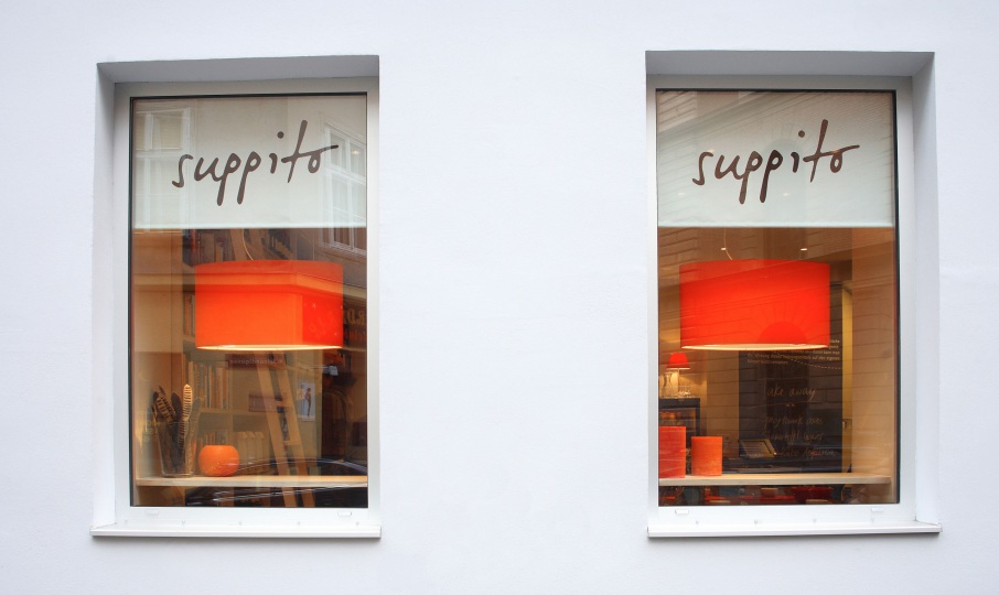 Ingwerfarbene Wände und ein grünteefarbener Boden, Türen in Radicchio- und Auberginetönen stimulieren die Sinne. Einbaumöbel in aufgehelltem, ehrlichen Birkenholz ergänzen das freundliche Ambiente. Die Wände sind mit Texten der Philosophie des Kochens versehen und unterstreichen die Inhalte von Suppito. Ein bisschen Chilli und rote Linsen setzen hier und da kraftvolle Farbakzente.