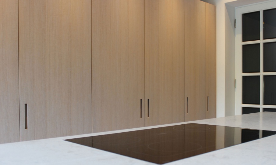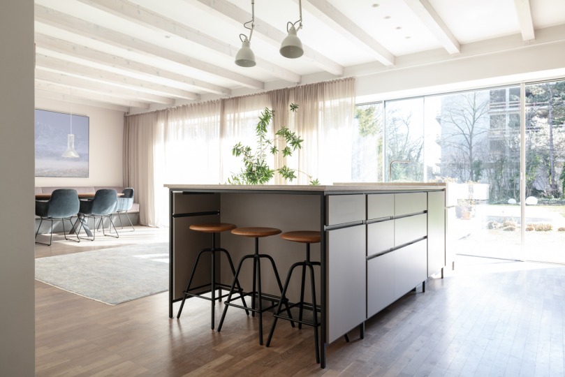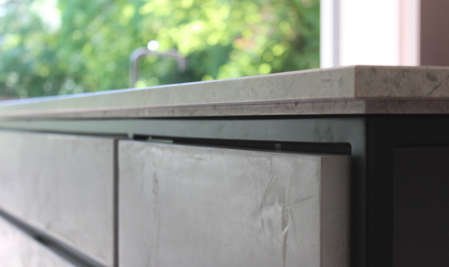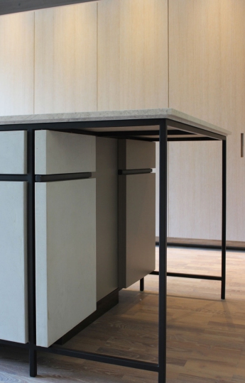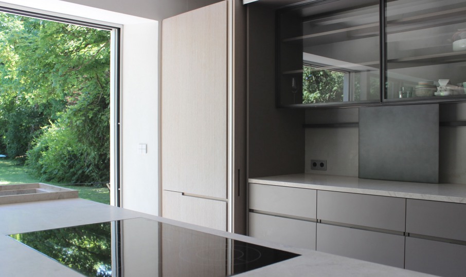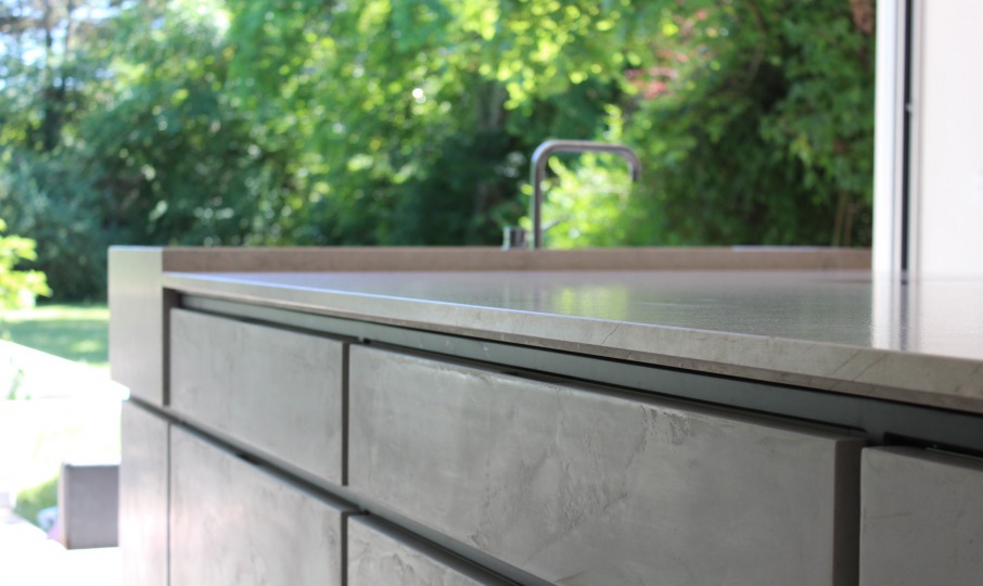 Mittig vom Raum befindet sich die Kochinsel. Die wundervolle Fossil Arbeitsplatte, sandgestrahlt und gebürstet in einem dezentem Beige, geht rücksichtsvoll ins Spülbecken über. Getragen wird sie von einer filigranen Metallkonstruktion in welcher sich Schubladen befinden dessen Fronten lackiert und mit Tadelakt gespachtelt sind. Dadurch, dass die Kochinsel auf feinen Füßen steht, erhält sie eine gewisse Leichtigkeit und passt sich wie ein Möbelstück dem Raum elegant an.