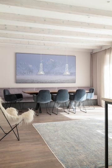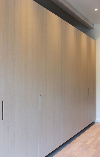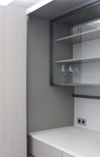 Die Küchenzeile, welche sich entlang der Wand befindet, beinhaltet neben den Geräten zusätzlichen Stauraum. Diese kann je nach Wunsch durch Schiebetüren ganz einfach offen oder versteckt sein. Die Schiebetüren aus hellem Holz wirken wie ein Teil vom Raum und lassen in geschlossenem Zustand kaum erkennen wie viel sich dahinter verbirgt.