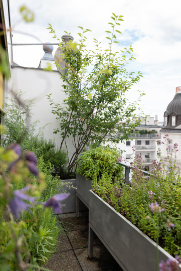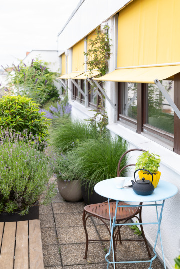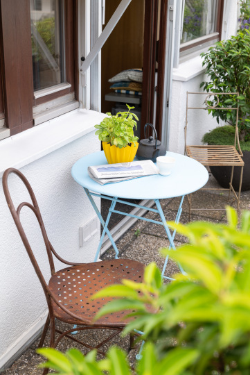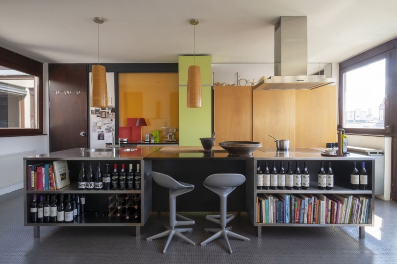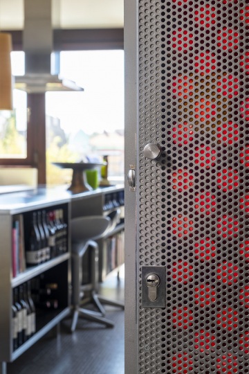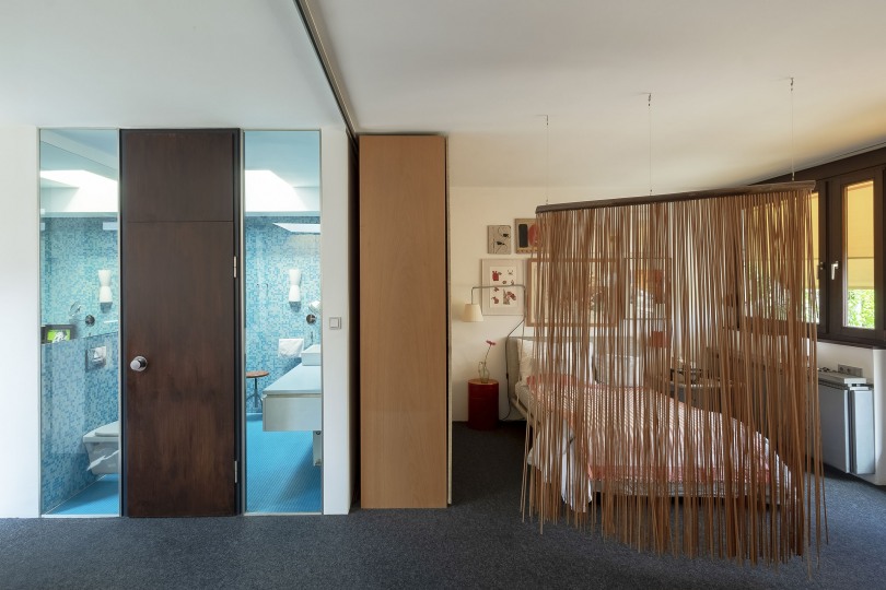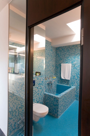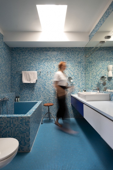 Materialien wie Nadelfilzboden, mit Bast bespannte Kästen und die Verspiegelungen der Bäder reflektieren Erinnerungen an das Architektenhaus in dem die Bewohnerin aufgewachsen ist. Die blau schattierten Mosaik Wandbeläge in den Bädern stellen den Bezug zu den Sommerurlauben am Meer her. Bezüge und Erinnerungen sind dafür verantwortlich eine wohnliche und individuelle Atmosphäre zu erzeugen.